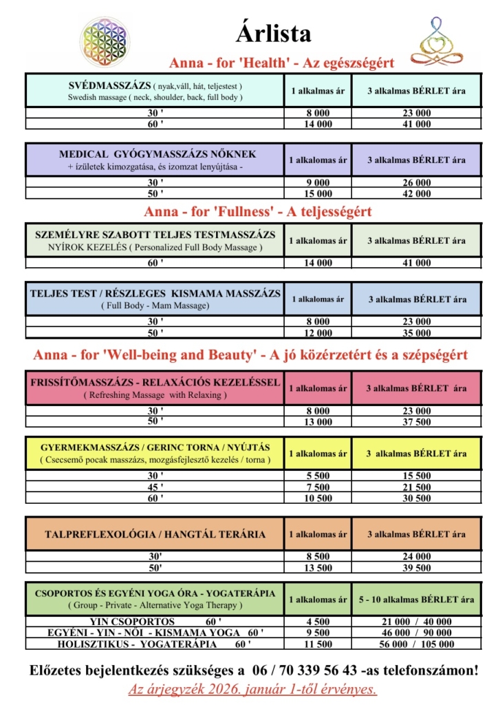 Massázs Árlista